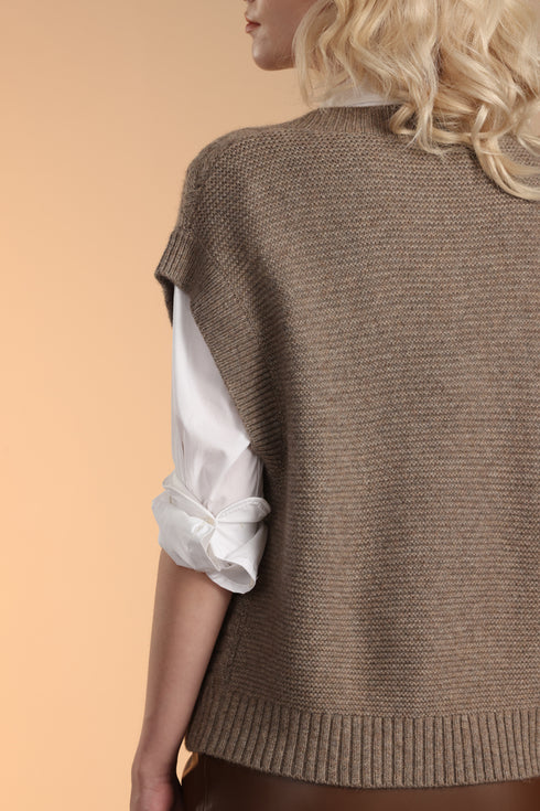 Ladies 50% nylon 30% wool 20% camel knitted vest, links pattern allover, ribbed neck, armhole and hem.